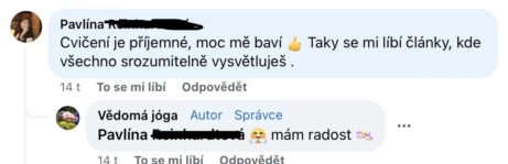 Dobrý den paní Polesná, chtěla jsem Vám dát zpětnou vazbu na Vaše online kurzy jógy. Už si nevybavím, jak jsem se k Vám vlastně dostala, asi jsem jen zadala do googlu "online lekce jógy" nebo tak nějak 🙂 Máte to sestavené přesně tak, jak mi vyhovuje (k dispozici několik lekcí, dokonce i meditací a bonusová videa - a to bez časového omezení). Nikdy jsem necvičila poctivě každý den a s malými dětmi jsem byla ráda, když jsem si na sebe udělala čas alespoň 1x týdně. Nyní se snažím cvičit každý pracovní den (kompenzace sezení u PC a dejme tomu i troška případného stresu), o víkendu se většinou více hýbu a tak jsem neměla takovou potřebu si zacvičit. Moc mi Vaše jóga pomáhá zklidnit se. Vždy jsem bývala úzkostnější, nyní "v době korony" se mi mé stavy výrazně zhoršily - s vědomím toho, že patřím do rizikové skupiny (astma a autoimunitní onemocnění štítné žlázy). Aktuální zjištění: když necvičím, pociťuji úzkost (i fyzicky mě bolí hrudník a hůř se mi dýchá), když cvičím cítím se dobře. Moc Vám DĚKUJI