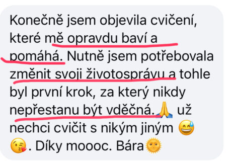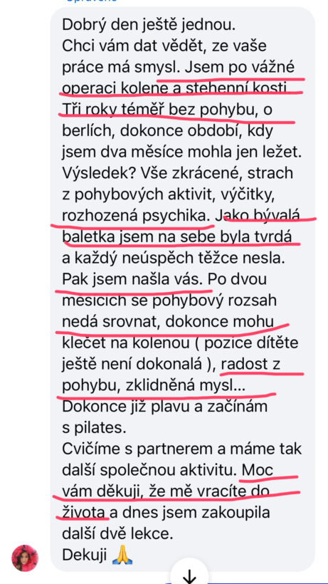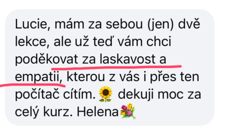 Dobrý den, Luci, upřímně mě to k on-line kurzům nikdy netáhlo, měla jsem obavy, že podle videíí nezvládnu cvičit. Tak jsem Vám chtěla poděkovat, že jste mé obavy rozpustila a předčila mé očekávání. Videa jsou natočená, tak že jim rozumím, dokáži se zkorigovat a možná mi to doma jde lépe, protože se lépe uvolním a nestresuje mě přítomnost ostatních. I tu laskavou atmosféru tam cítím. Ještě jednou moc děkuji, za zboření mých obav a za celý skvělý kurz🥰.