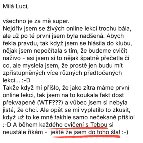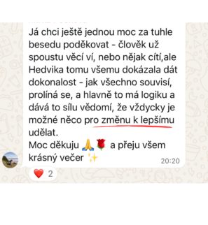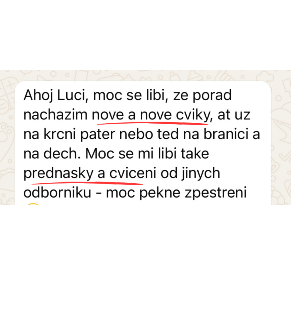 Ještě před lekcí založím WhatsApp skupinu, kde s vámi budu sdílet mini cvičení a doporuční do každého dne. Po skončení lekce vám na týden zpřístupním členskou sekci KLUBU, ať si můžete vyzkoušet jak se tam máme 🙂